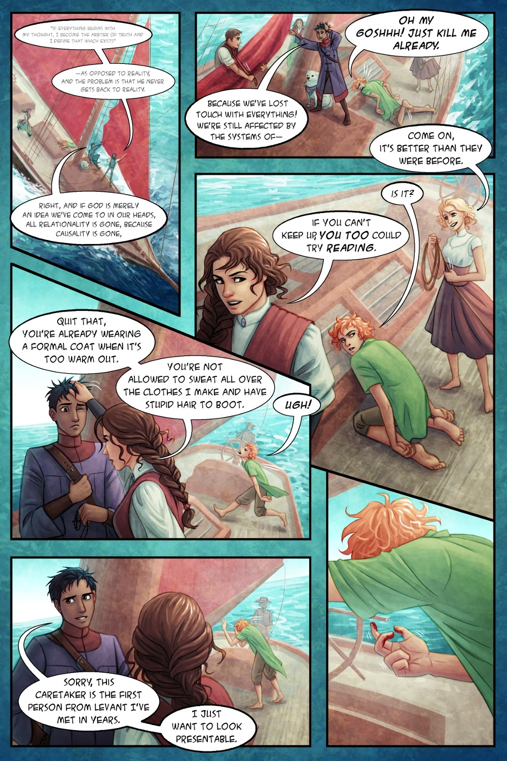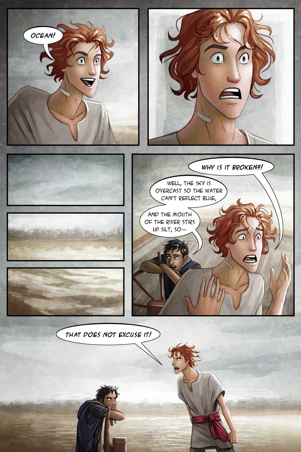 The dark-haired, unamused guy is Apen, and the red-headed character is Enel. He’s currently very disappointed that the ocean doesn’t look like the dramatic, crashing blue painting he’s seen. We understand, Enel. The ocean is just moody today. Like Apen.
